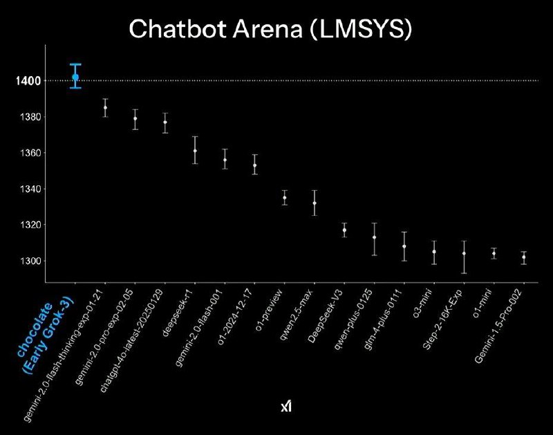 — ранний (незаконченный) чекпоинт Grok 3 занимает первое место на LMSYS Arena во всех категориях (первая и вторая картинки), в общем рейтинге без учёта контроля стиля ответов он первым перешагнул 1400 очков. В категориях «общий, с контролем стиля», «креативность/письмо», «длинные запросы» и «следование инструкциям» делит это самое первое место с другими моделями, например, с последней версией ChatGPT.