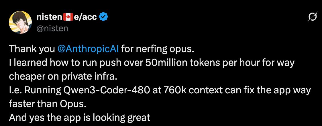 увидел в твиттере пост чувака, который гоняет qwen3-coder на собственной инфре (через primeintellect.ai) и говорит, что это сочнее, чем Cursor / Claude Code.