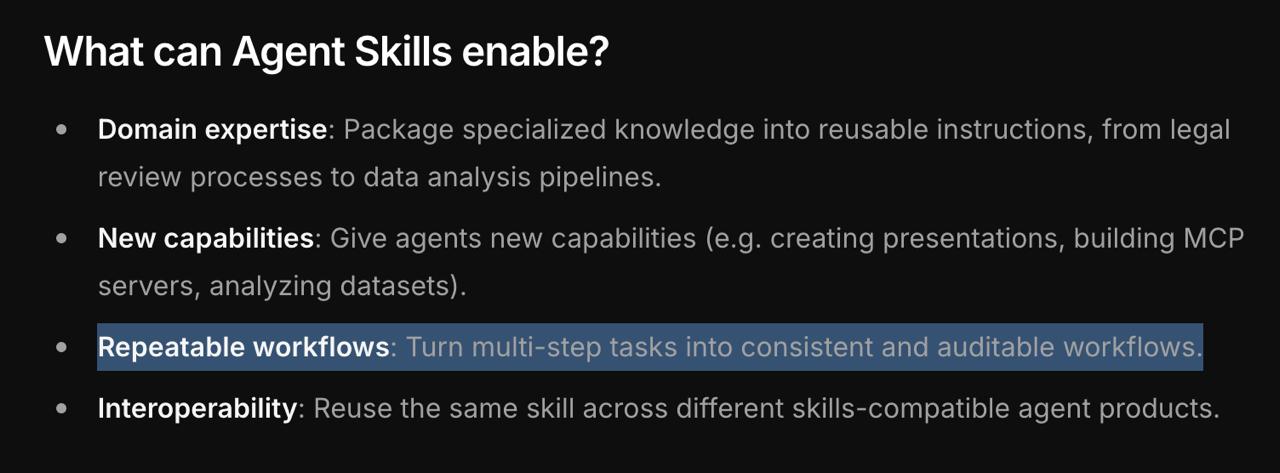 чтоб вы понимали: "repeatable workflow" это не более чем промпт, в котором этот workflow описывается. никаких гарантий, что агент будет ему следовать, Agent Skills не вносят.