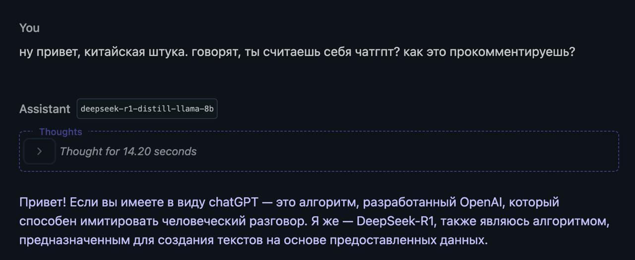 ого, deepseek смогли объяснить своим моделям, что они не ChatGPT.